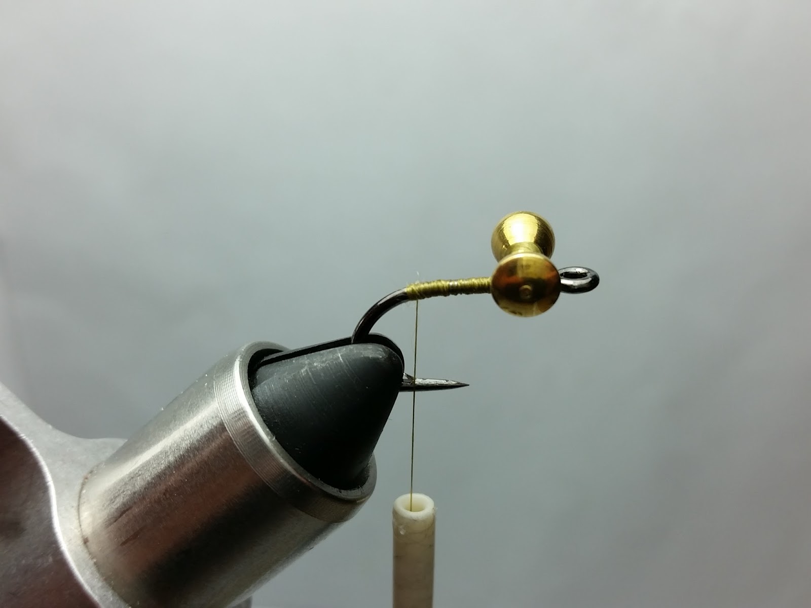 Rotate your vise 180 degrees or flip your fly over. Than line up the middle of your newly straightened pinch of dubbing to your thread (at the rear base of the dumbbell eyes).